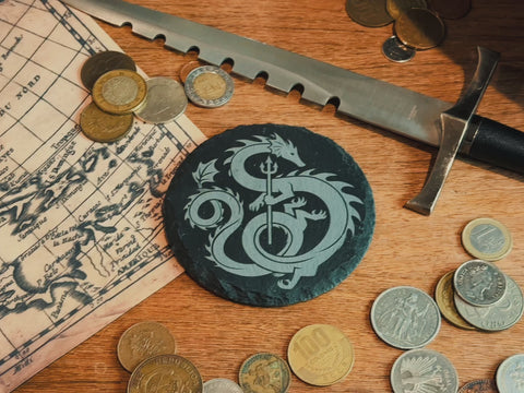 This eye-catching piece features a long, graceful sea dragon wrapped around a powerful trident, intricately etched into durable natural slate.