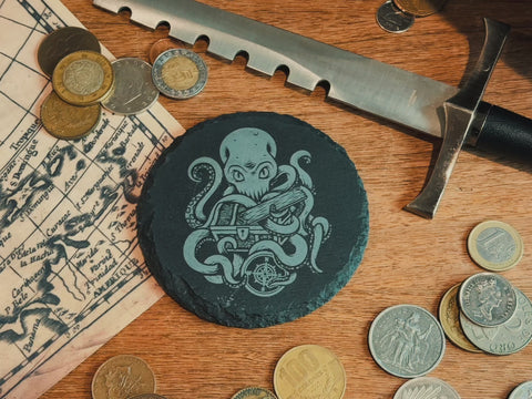Avast! Behold our Octopus Coaster, a true gem for any home or tavern. Carved from high-quality natural slate, this coaster features a striking design of a clever octopus clutching a pirate's treasure chest, an old compass, and a piece of driftwood. The intricate artwork is laser-engraved right into the stone, ensuring it'll weather many a storm (or spill).